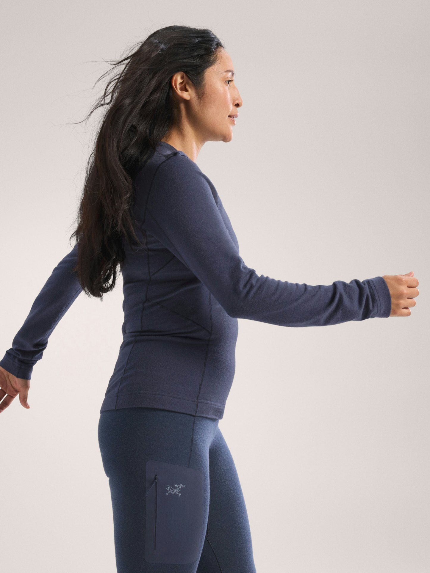 Our trimmer fit is patterned to stay close to the body through the chest, waist, hip, and thigh. Its low profile eliminates bulk, moves with the body, and fits comfortably over first layers or under outer layers.
